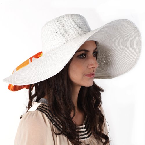 Luxury Lane Women's White Floppy Paper Straw Sun Hat With Removable Orange Scarf